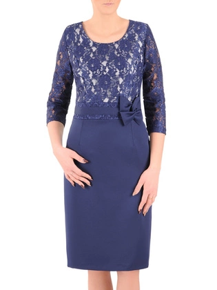Granatowa sukienka z kokardą w talii, kreacja z koronkowym topem 37494