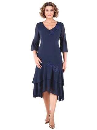 Szyfonowa sukienka z ozdobną falbaną, granatowa kreacja z aplikacjami z koronki 24811