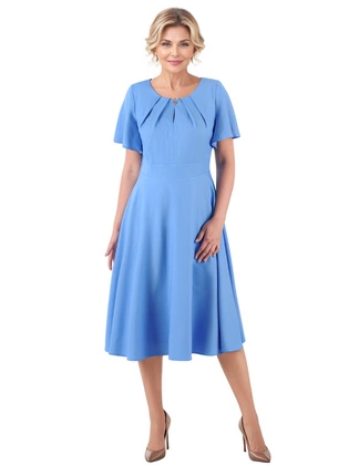 Niebieska elegancka sukienka midi na wesele i komunię – rozkloszowana kreacja o kobiecym fasonie 39833