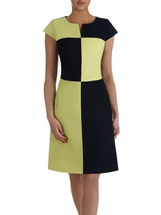 Pistacjowo-granatowa sukienka Pamela II, nowoczesna kreacja w geometryczny wzór.