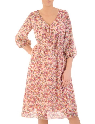 Sukienka w kwiaty z ozdobną falbaną przy dekolcie 33306