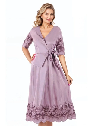 Sukienka na wesele, komunię, wrzosowa kreacja z kopertowym dekoltem 36295