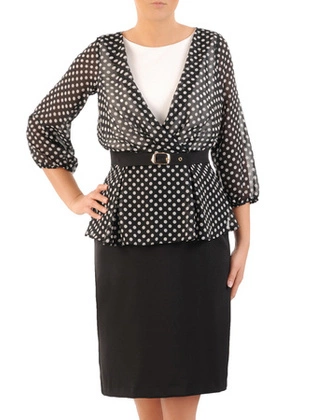 Elegancka sukienka w groszki, kreacja z szyfonową górą i ozdobnym paskiem 34556