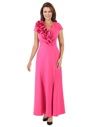 Sukienka wyszczuplająca maxi z połyskiem – elegancka sukienka wieczorowa na wesele, dekolt kopertowy, fason z rozcięciem 39982