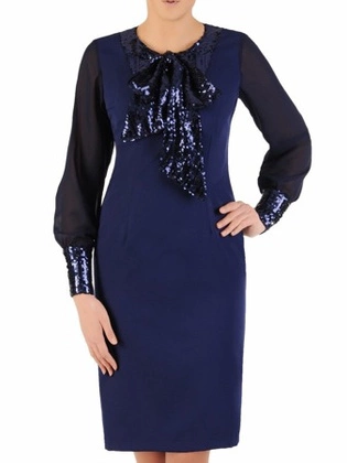 Granatowa sukienka z cekinową kokardą i bufiastymi rękawami 24413