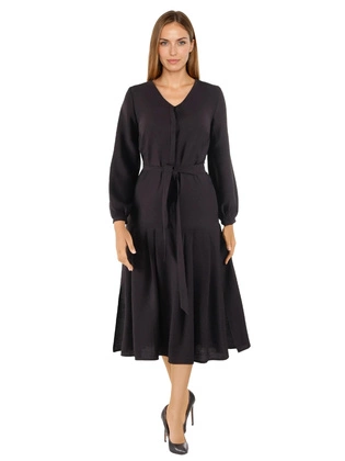 Czarna sukienka damska midi z dzianiny – trapezowa, elegancka, z paskiem i kieszeniami 40705