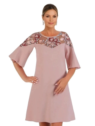 Sukienka z ozdobnym karczkiem, elegancka kreacja z tkaniny i koronki 20003.