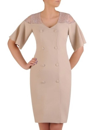Beżowa sukienka z ozdobnym, dwurzędowym zapięciem 20437