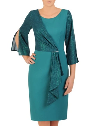 Sukienka damska wizytowa, zielona kreacja z ozdobnie rozciętymi rękawami 38071