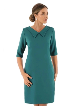 Zielona sukienka z kontrastowymi, wyszczuplającymi wstawkami 34839