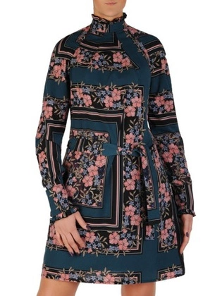 Trapezowa sukienka z modną stójką, kreacja z wiązaniem w talii 18901