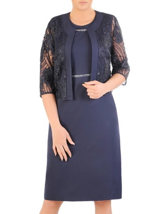 Elegancki granatowy komplet, prosta sukienka z koronkowym żakietem 33518