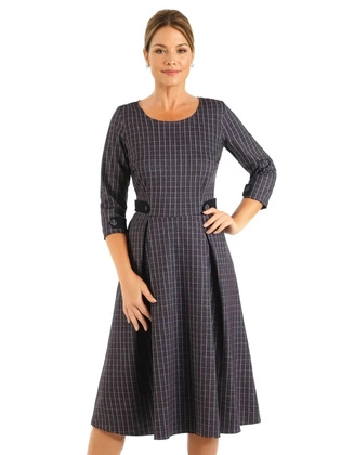 Sukienka w kratę 17739, jesienna kreacja z wiązaniem w pasie.