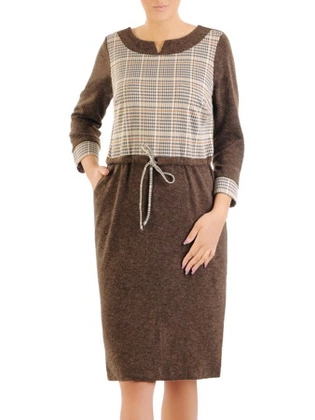 Prosta sukienka na jesień w kratkę, kreacja z modnymi patkami 31079