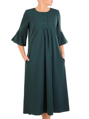 Zielona sukienka z tkaniny, kreacja z ozdobnymi kieszeniami 23163