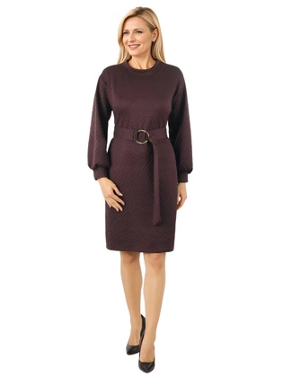 Brązowa sukienka dzianinowa midi – elegancki fason ołówkowy ze stójką i paskiem 40633