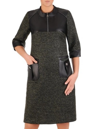 Prosta sukienka ze skórzanymi wstawkami, kreacja z modnej dzianiny 23393