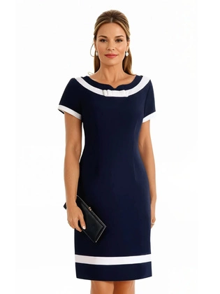 Sukienka damska, elegancka, granatowa kreacja z kontrastowymi wstawkami 9044