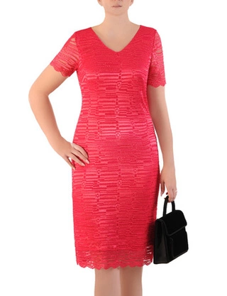 Pudrowa sukienka z koronkową aplikacją, elegancka kreacja wyszczuplająca 21241