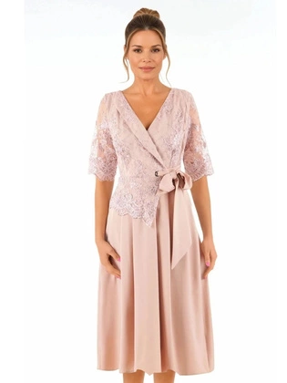 Pudrowa sukienka midi z ozdobnie wyciętym dekoltem 35311
