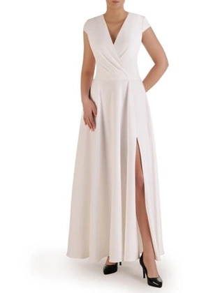 Sukienka z ozdobnymi zamkami Emilia II, piękna kreacja w kolorze białym.