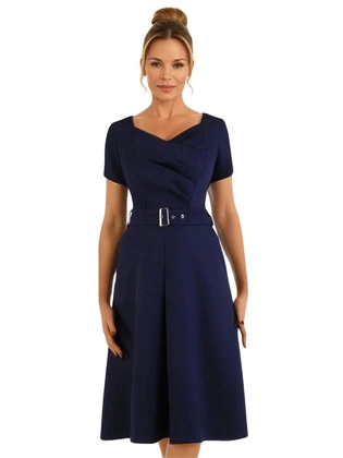 Sukienka wizytowa, granatowa kreacja z marszczonym dekoltem 19625