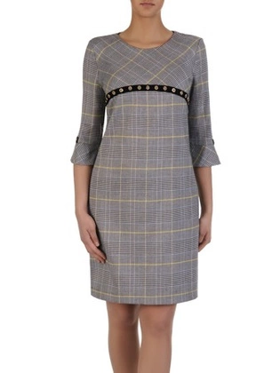Modna sukienka w kratę 15569, wiosenna kreacja z ozdobnymi wstawkami