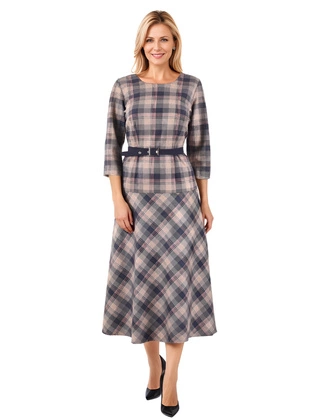 Sukienka damska maxi w kratę z paskiem – elegancka sukienka wizytowa z dzianiny 40456