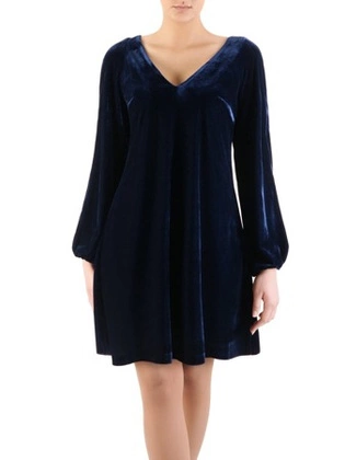 Efektowna sukienka z aksamitu 14561, granatowa kreacja z modnymi rękawami.
