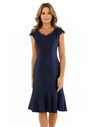 Trapezowa sukienka z modnymi rękawami 18312, chabrowa kreacja wizytowa.