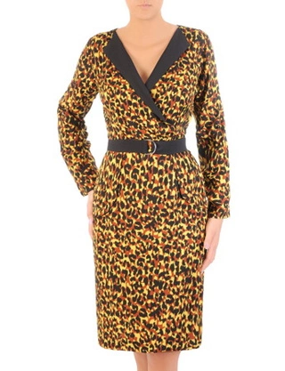 Sukienka w cętki z kopertowym dekoltem, kreacja z kieszeniami 33084