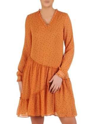 Szyfonowa sukienka z falbanami, zwiewna kreacja w jesiennej kolorystyce 24785