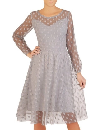 Modna sukienka w groszki 16628, zwiewna kreacja z szeroką falbaną.