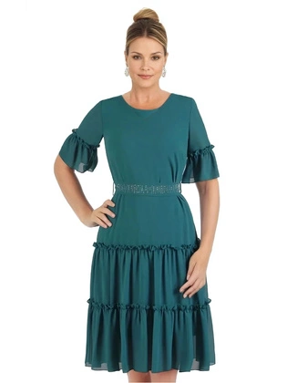 Sukienka koktajlowa, elegancka, szmaragdowa kreacja z falbanami 25987