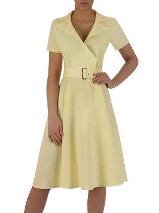 Rozkloszowana sukienka z modnym kołnierzem 15712, żółta kreacja z paskiem.