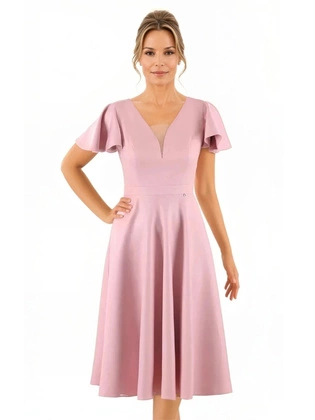 Sukienka na wesele, pudrowa rozkloszowana sukienka midi z tiulową wstawką przy dekolcie 38501