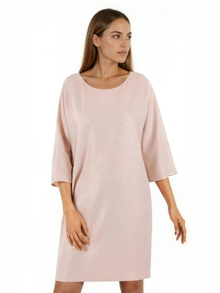 Elegancka pudrowa sukienka, kreacja z koronkowymi rękawami 28756