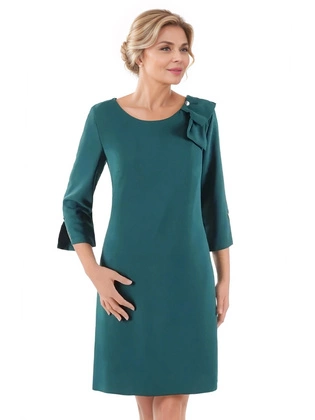 Elegancka sukienka z ozdobnym dekoltem, zielona kreacja w prostym fasonie 38808
