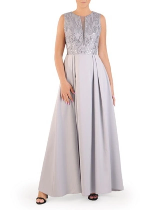 Długa sukienka na wesele, rozkloszowana kreacja z koronkowym topem 33703