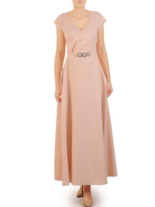 Beżowa suknia z kopertowym dekoltem i nowoczesną aplikacją 30903