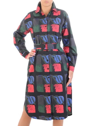 Sukienka koszulowa w oryginalnym wzorze, kreacja z paskiem 33742