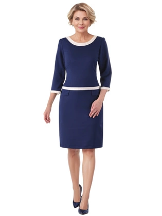 Granatowa sukienka z lamówkami Ksawera II, klasyczna kreacja z tkaniny.
