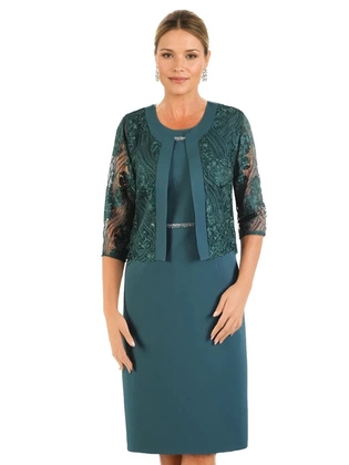 Elegancki granatowy komplet, prosta sukienka z koronkowym żakietem 33518