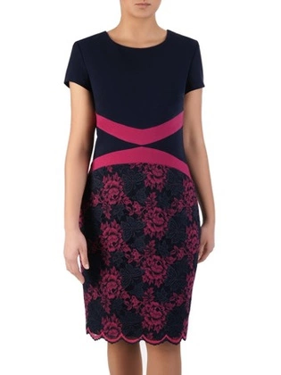 Sukienka damska, granatowa kreacja z koronki i szyfonu 29218