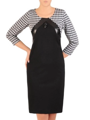 Elegancka sukienka z łączonych materiałów, luźna kreacja z ekoskórą 31382