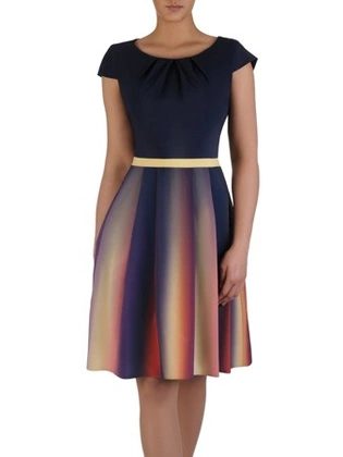 Rozkloszowana sukienka z paskiem, kreacja z gumkami na rękawach 27194