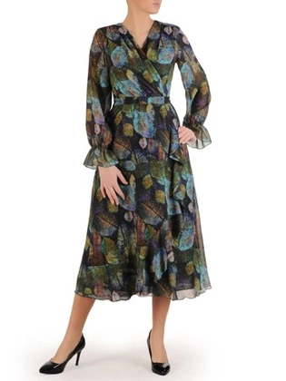 Kopertowa sukienka z falbankami na rękawach 25410