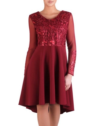 Rozkloszowana sukienka ozdobiona cekinami 14434, kreacja z koronkowym topem.