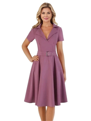 Rozkloszowana sukienka z modnym kołnierzem 15713, wrzosowa kreacja z paskiem.