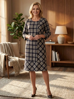 Granatowa sukienka dla 50-latki – wyszczuplająca sukienka wizytowa midi z białymi wstawkami 35518